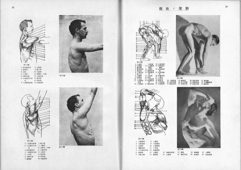 本の内容は、290点の解剖図や写真があり、それぞれを見比べながら骨格や筋肉の作り・名前を確認できる、というものです。人体の表現をする芸術家たちに向けられた参考書は、限定1000部で出版されました。戦火に燃えた日本で、何冊の本が現在まで残っているのだろう、と思わずにいられません。
