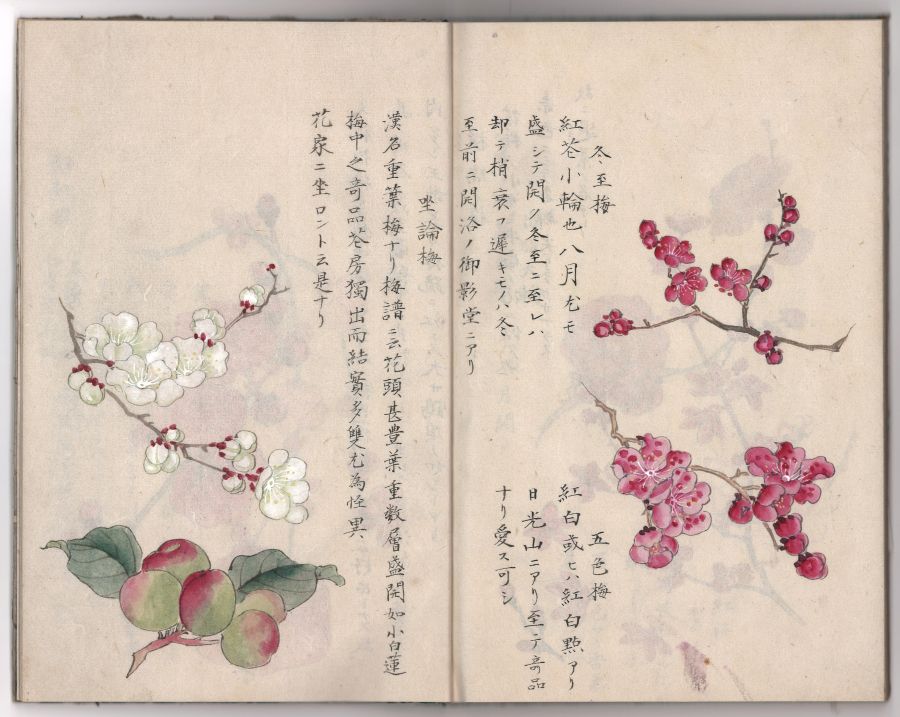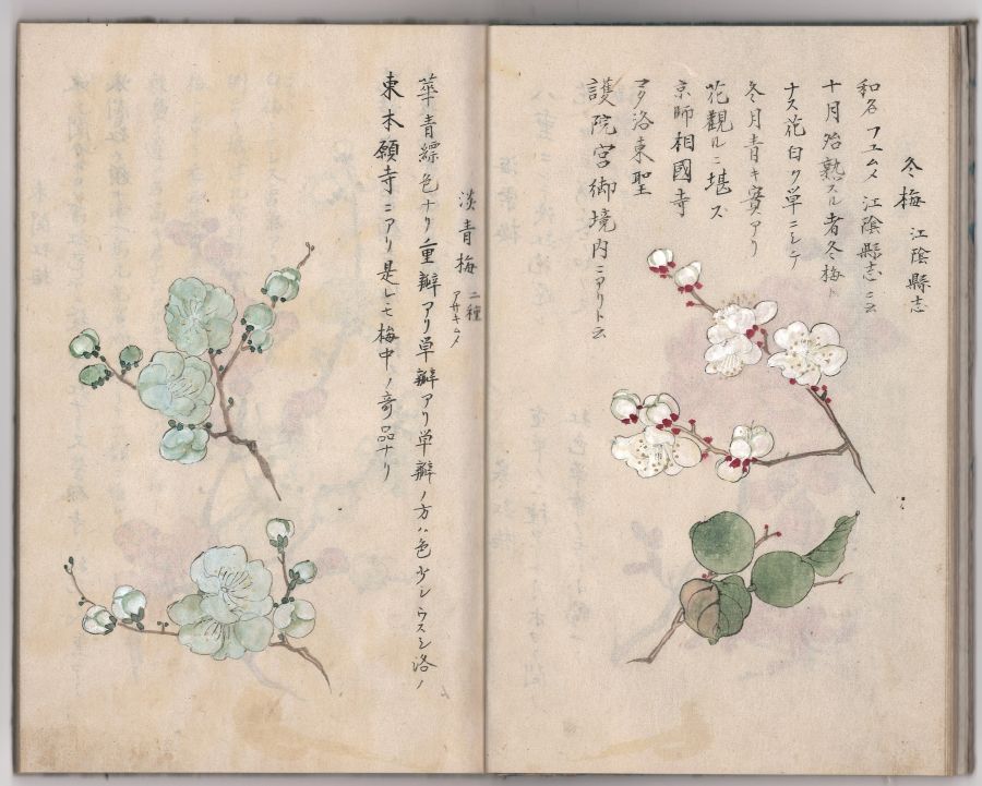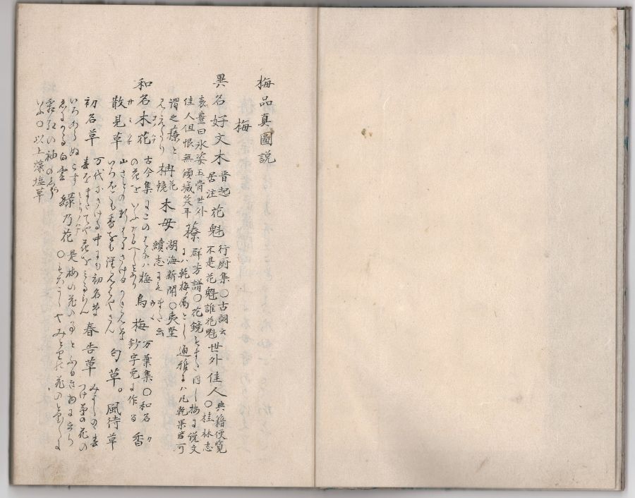 休みの日、図書館へ向かう日陰の小道を曲がったところ、白梅が満開になっていて驚かされました。日向にある梅の木でも、まだちらほらとしか花を開いていないのに、寒そうな小道の梅が満開だったのです。樹木もみな、それぞれ、というところでしょうか。本日はそのような色々な「梅」を紹介している『梅品真図説』を取り上げます。