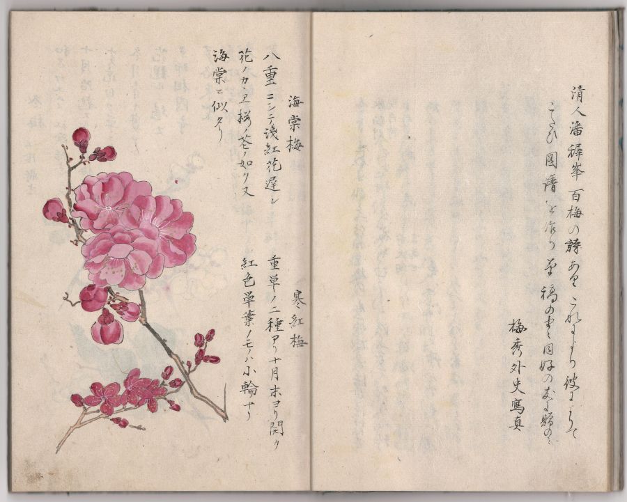桜と並んで我が国の花の代表でもある梅のいろいろを楽しめる本です。5丁ほどの解説のあとには、美しい絵入りで各地・各種の梅が紹介されます。梅の絵の傍に、この梅は相国寺にある、とか、東本願寺にある、などと書かれています。筆写本、手書きの着色です。