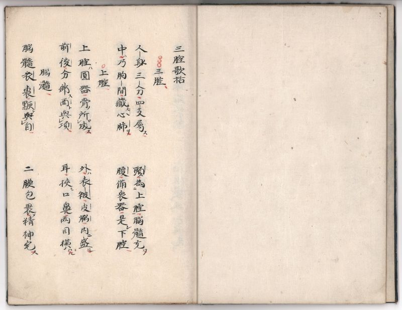 今月は歌で身体の組織を説明している『三腔歌括』と題された写本をご紹介します。十丁ばかりの薄い冊子には、54の項目があり、それぞれに歌で説明がついています。
