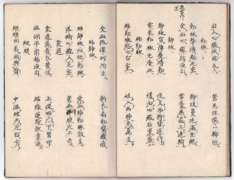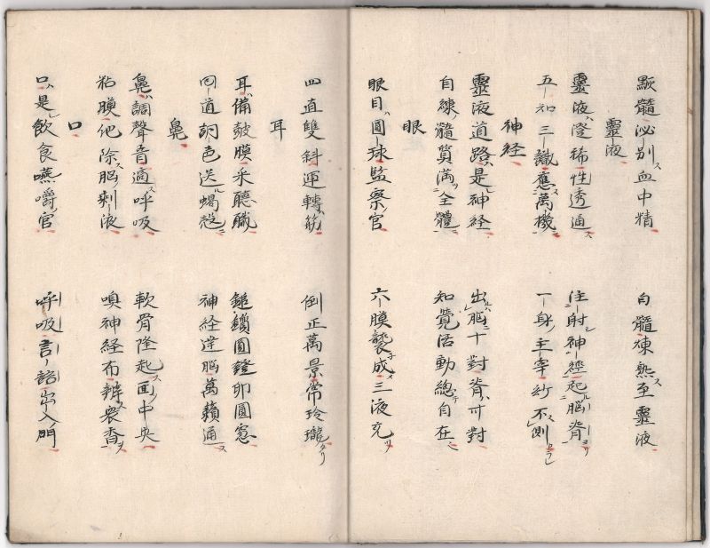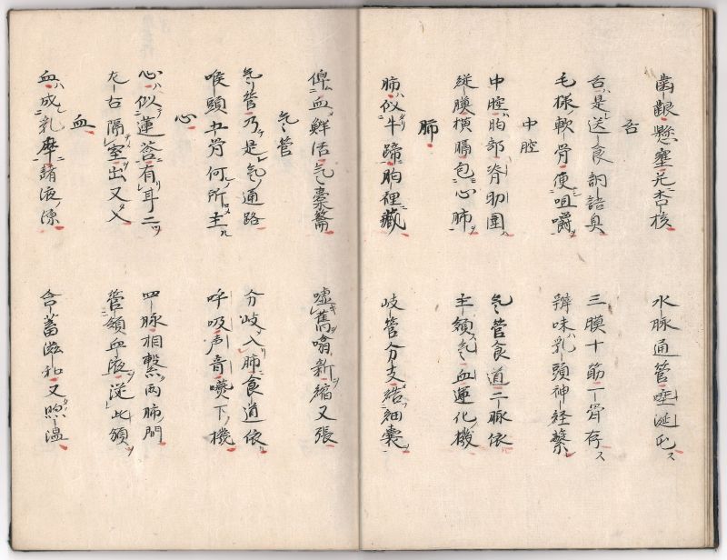 身体の中でも微細な器官があげられており、膜や管に着目して編集されているようにみえます。最後の「十器」には、「十器 基を剏(はじ)めて人身を成す/表被皮腺幷水脉/脂膜靭帯膜骨筋/総て血液を繊維通するに頼る」と書かれ、ここにあげられた器官が血液循環のある、身体の基本となるものだという認識が示されています。小学校で習うような大きな臓器だけでなく、われわれ人類のこうした小さな「部品」にも目を凝らして、その働きをみていこうとした先人の姿勢が伺えます。