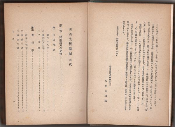 今月は昭和17年10月1日に発行された『明治先哲医話』をご紹介します。太平洋戦争のさなかに刊行されたこの本は、安西安周(あんざい やすちか)が「食養と漢方」「漢方と漢藥」「日本醫學」「醫文學」などの雑誌に書いたものを加筆補正して作られたものです。安西には『日本儒醫研究』という著書もあり、国立教育政策研究所教育図書館には、彼の蔵書が「安西安周文庫」として保存されています。https://crd.ndl.go.jp/reference/detail?page=col_view&id=3000002648