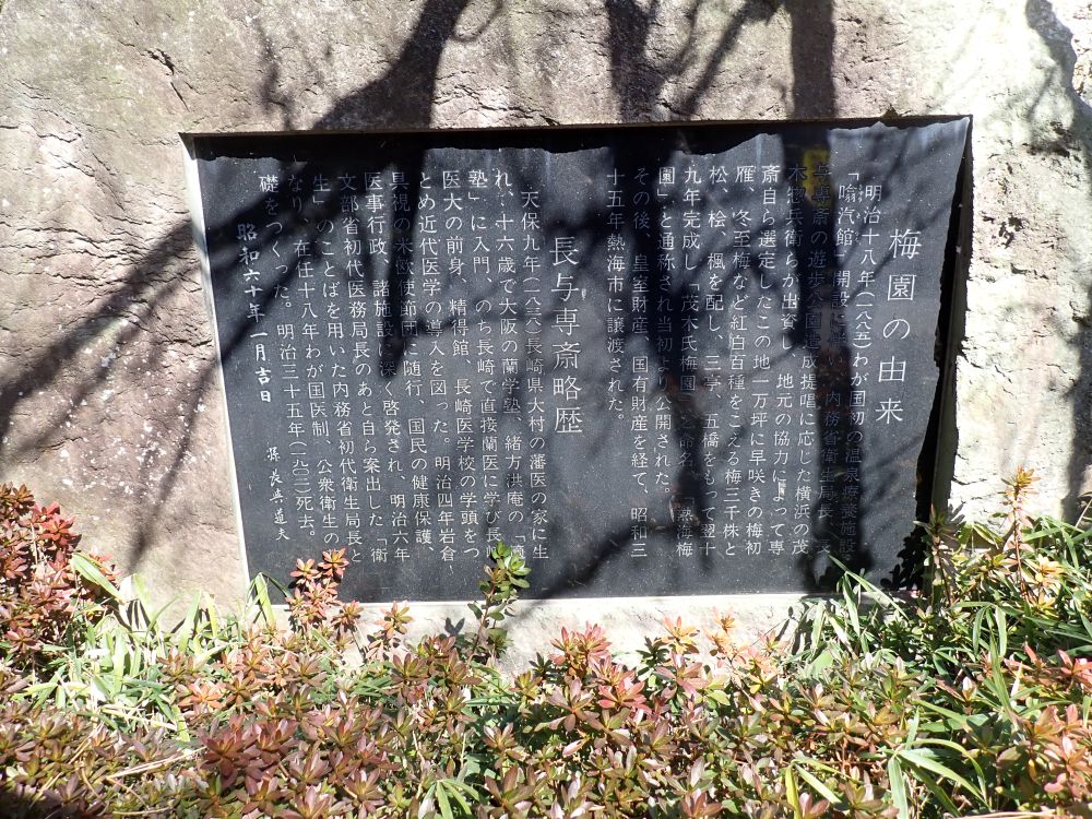 先日、熱海梅園に行った際、この梅園が日本公衆衛生の父といわれる長與専齋(以下 長与専斎とする 1838-1902)の提案で作られた、という内容の石碑を見つけました。ポンぺやマンスフェルトに学び、明治時代、岩倉使節団の一員として欧州を歩き、各国の医療制度や医療の実態、公衆衛生のシステムなどを見学した上で、日本の衛生や医療、国民の健康について考え、それを制度として整えた人物です。梅園の石碑には専斎が健康作りには温泉と散策がよいと提唱し、自らこの地を選定した、とありました。専斎の声に応じたのは横浜で生糸商人から財界の中心人物となった茂木惣兵衛で、そうした過去の人物たちの意思が今に伝えられて市民憩いの場になっていることに心が温かくなりました。