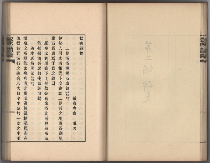 『松香遺稿』は専斎の三男である又郎(またお)が編集した本で、「松香遺稿序」には、この本が成った経緯が書かれています。巻のはじめに「昭龢申戌九月印行」という判がありますが、これは専斎の三十三回忌が9月8日であったので、その年忌に合わせて発行されたことを示しているようです。